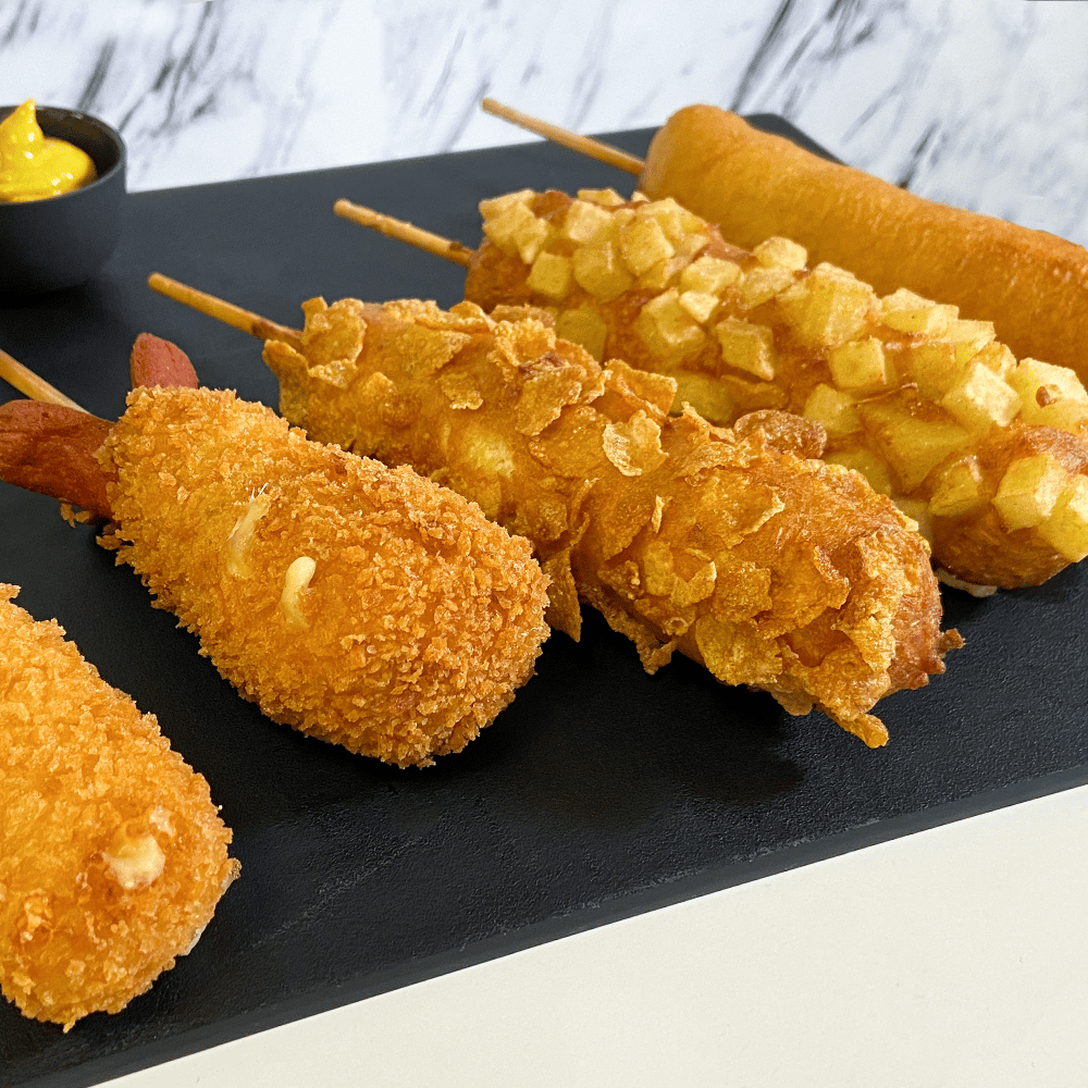 Para las empanizadas: pasar las salchichas por el batido primero y posteriormente por el Panko o por los cubos de papa ligeramente enharinados o por las hojuelas de maíz. Freír hasta que queden de color dorado uniforme.