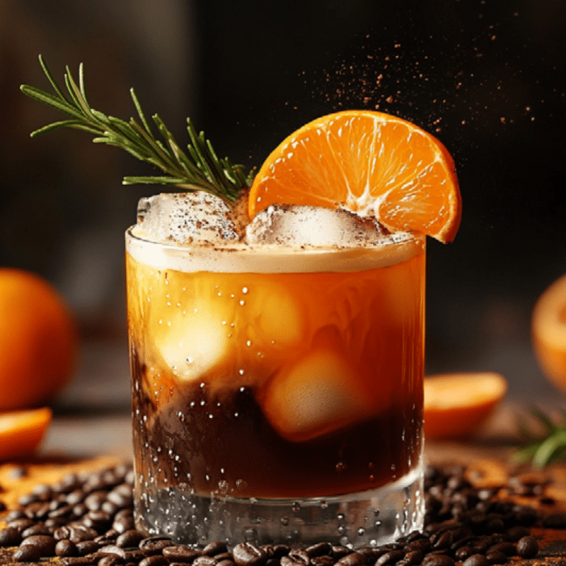 4. Decora con una rodaja de mandarina en el borde del vaso, una ramita de romero y algunos granos de café para darle un toque aromático.