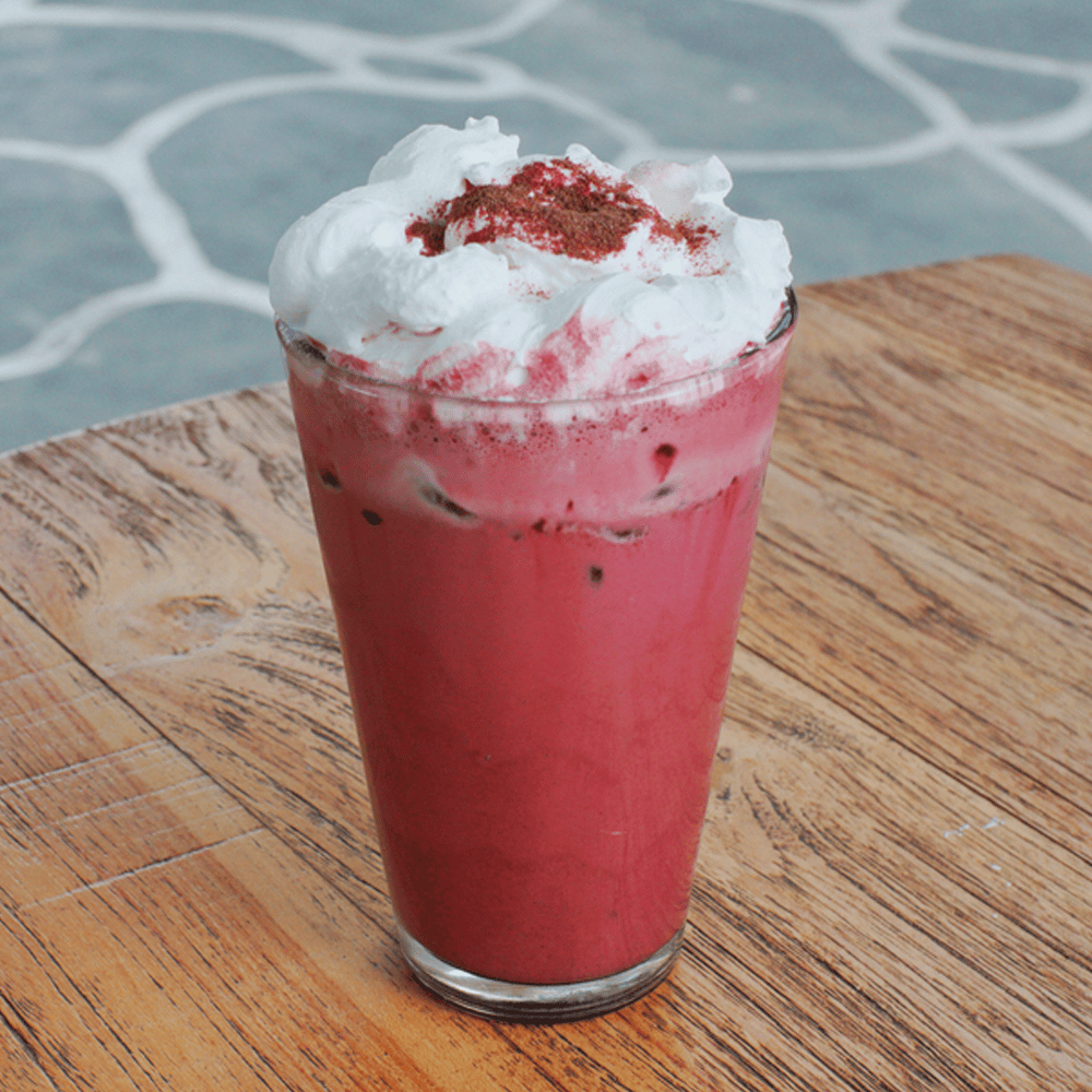 1. Colocamos en la Blender 5 oz de leche y 1 oz de Red Velvet DaVinci Gourmet.