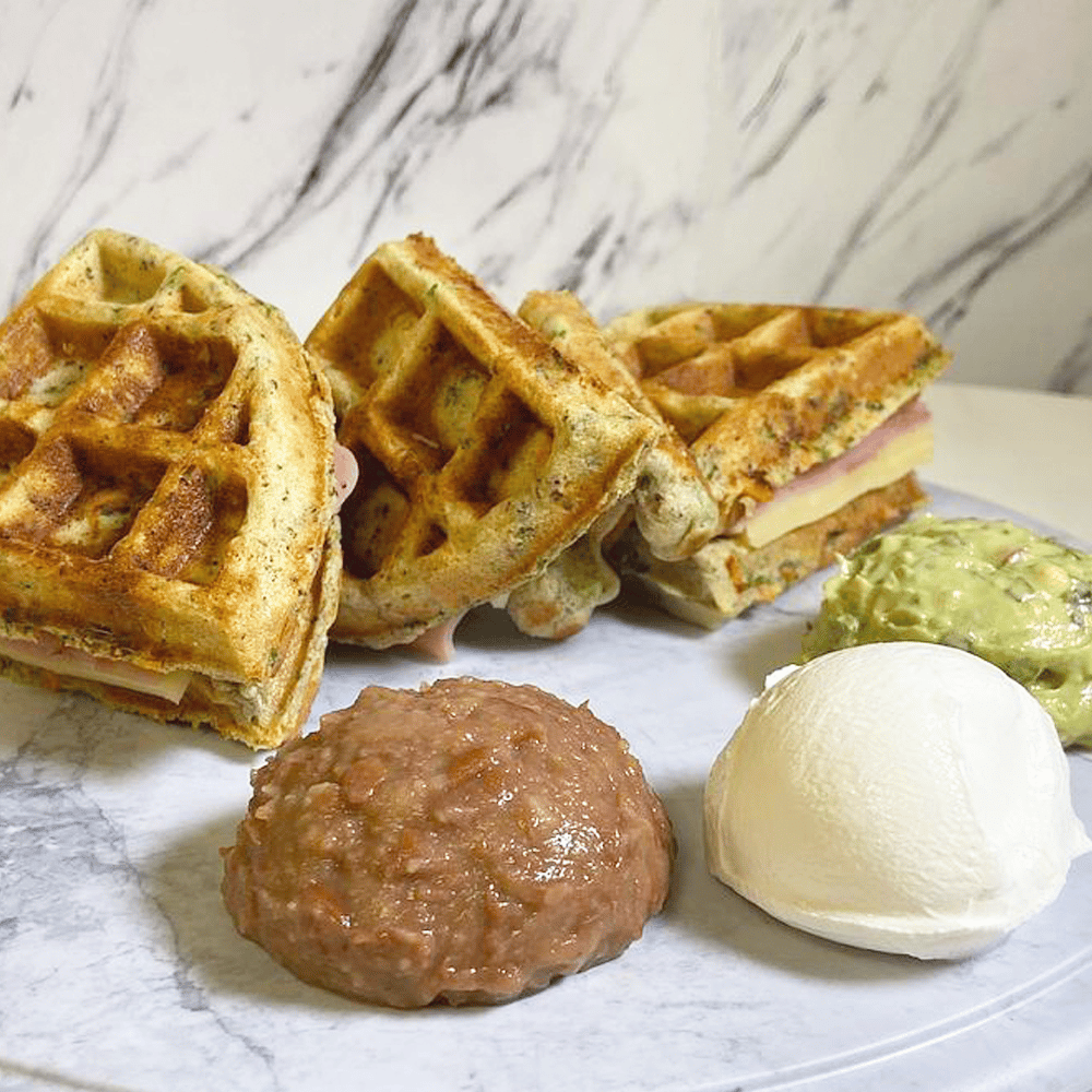 Cocinar en wafflera al punto. Elaborar un emparedado con el waffle de vegetales, jamón y queso. Servir de inmediato.