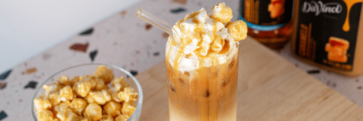 En una olla pequeña, derrite la mantequilla a fuego medio-bajo hasta que esté completamente líquida. Añade el jarabe DaVinci Gourmet Azúcar Morena y la salsa DaVinci Gourmet Caramelo a la mantequilla derretida, mezclando hasta que se incorporen. En un vaso alto añade la mezcla de mantequilla y vierte el Ginger Ale. Revuelve suavemente con una cuchara y decora con crema batida, más salsa de caramelo y palomitas caramelo.